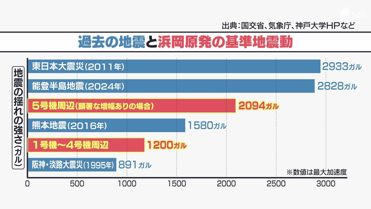 過去の地震では最大で▼阪神・淡路大震災で891ガル、▼熊本地震で1580ガルなどとなっていて、2023年に規制委員会が了承した浜岡原発の基準地震動は▼1号機から4号機周辺で1200ガル、▼5号機周辺では2094ガルでした。