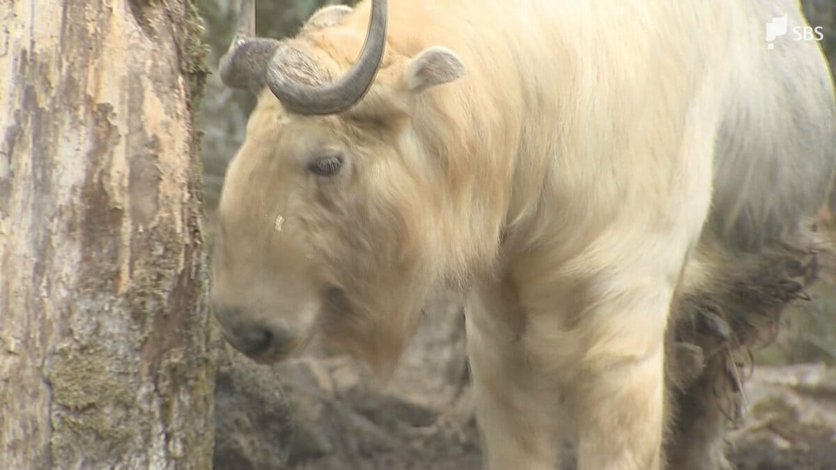 静岡県裾野市の富士サファリパークで、中国原産のウシの仲間、「ゴールデンターキン」の公開が始まりました。オスは成長すると、体の毛が金色に変わるということです。