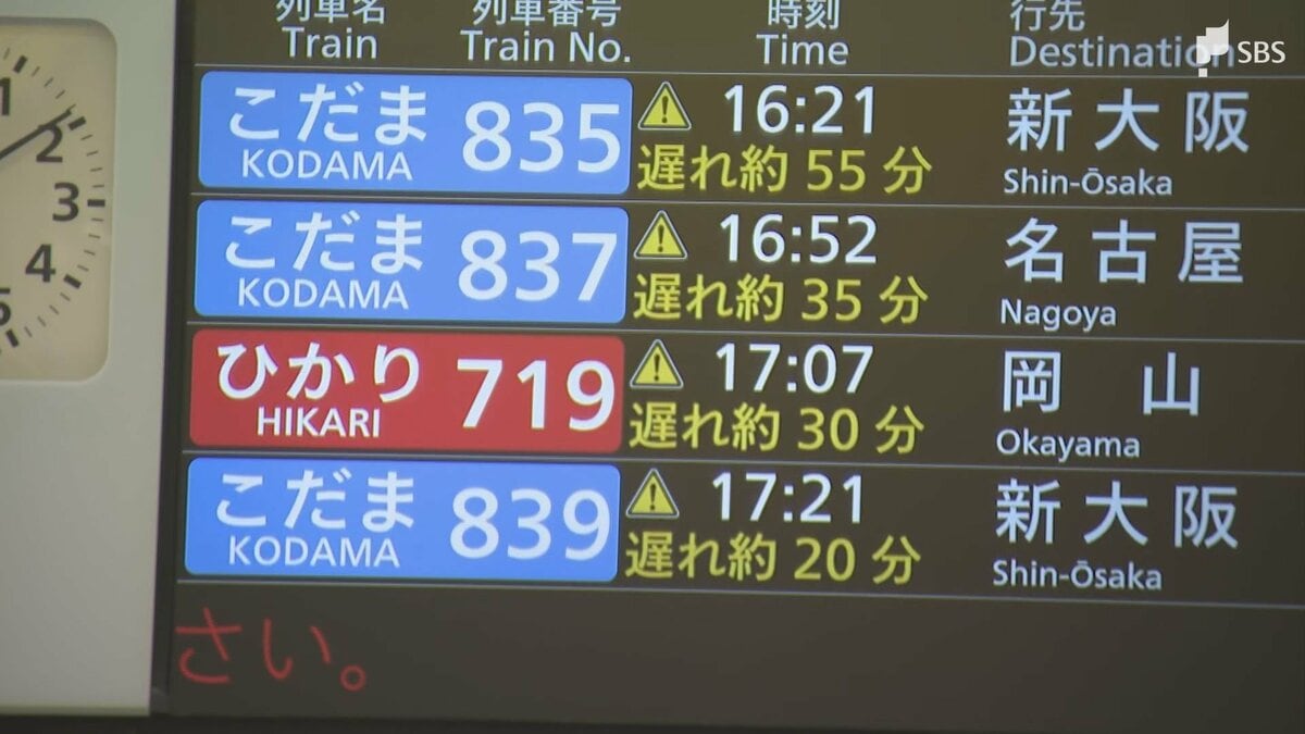 この影響で上り静岡~新富士駅間と下り東京~静岡駅間で約1時間、運転を見合わせたほか、遅れが出ました。