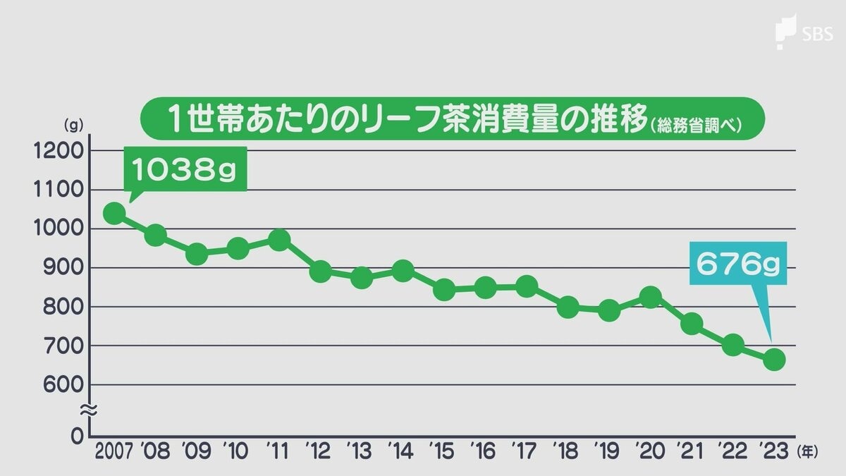 若者の「お茶離れ」などから世帯ごとのリーフ茶の消費量は落ち込む一方です。