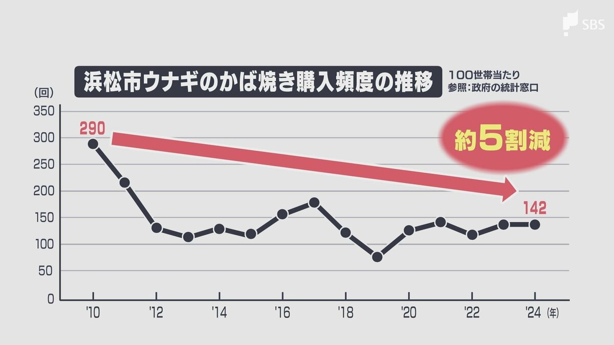 政府の調査によりますと、浜松市のウナギのかば焼きの購入頻度がここ15年ほどで約半分減っていることが分かります。