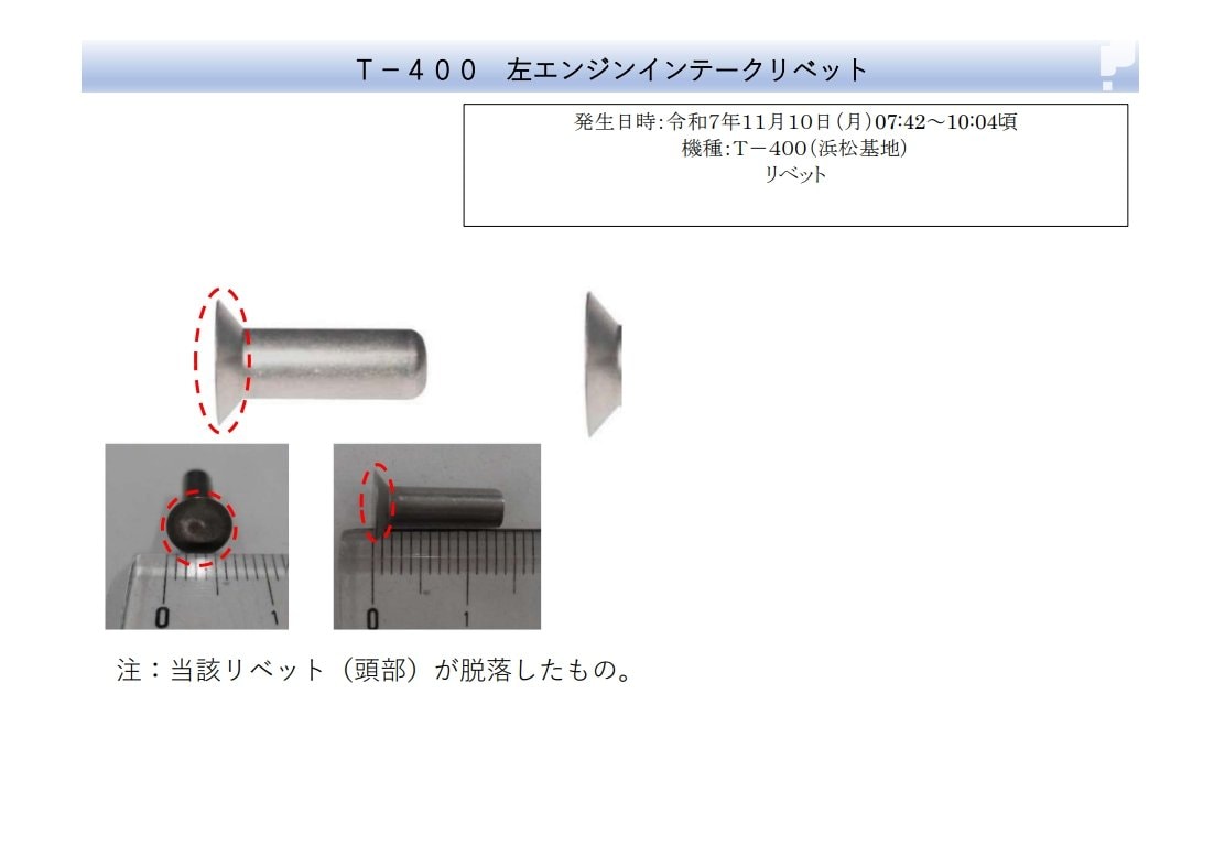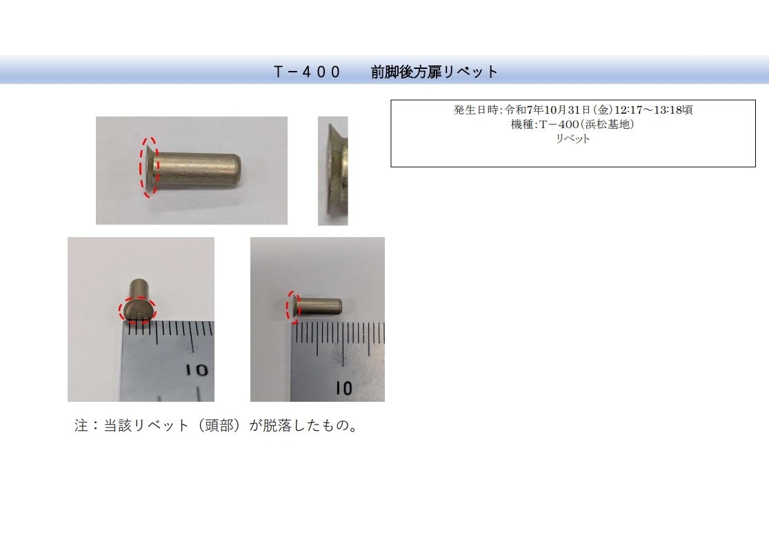 航空自衛隊浜松基地によりますと、10月31日午後、鳥取県の美保基地から浜松基地までフライトした「T-400」の、タイヤを格納するための扉の外板(がいばん)をとめるためのリベットの一部が落下、また11月10日午前、浜松基地を離陸後、太平洋上の空域で訓練を終えた「T-400」のエンジン外枠の部材を固定するためのリベットの一部が落下したということです。