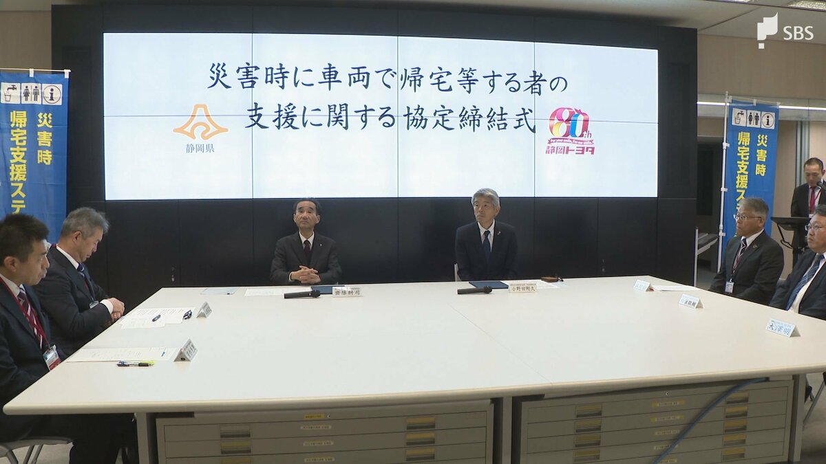 静岡県と自動車販売会社の「静岡トヨタ自動車」は、災害時、帰宅が困難になった人を販売店などの拠点で支援する協定を結びました。