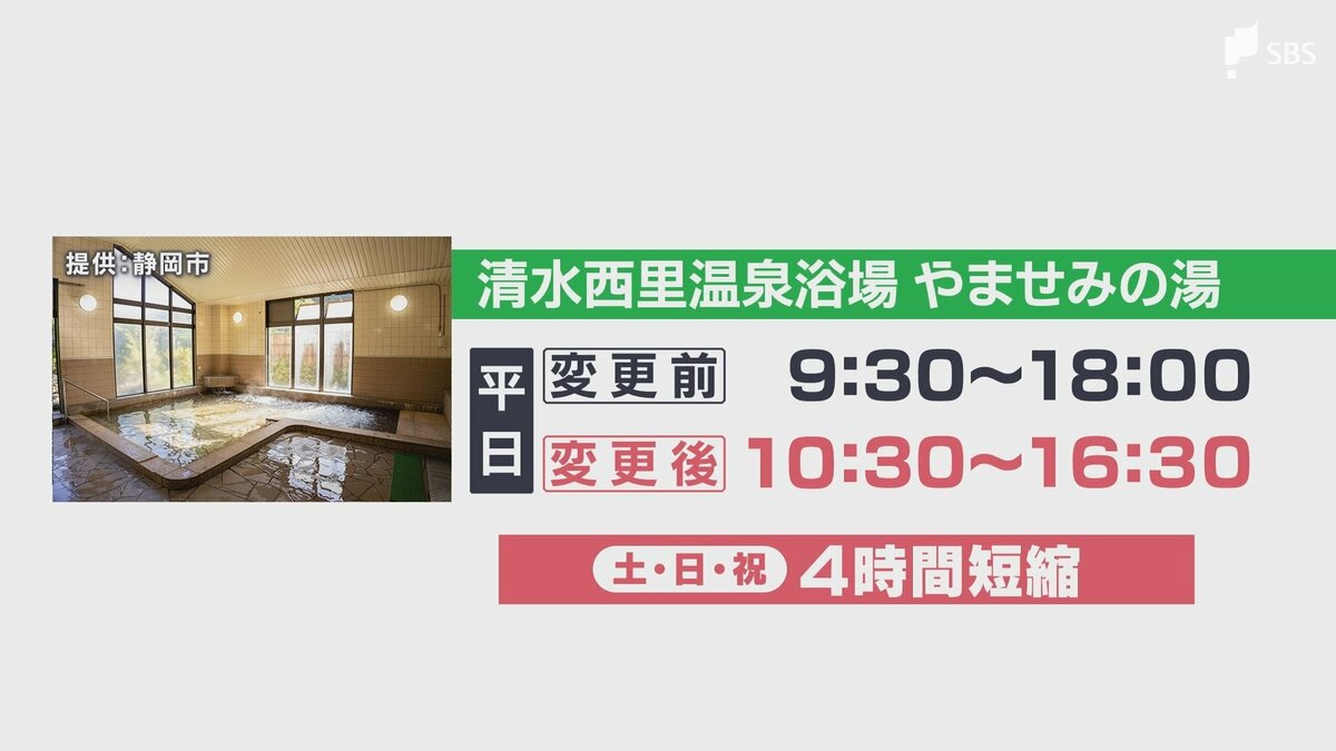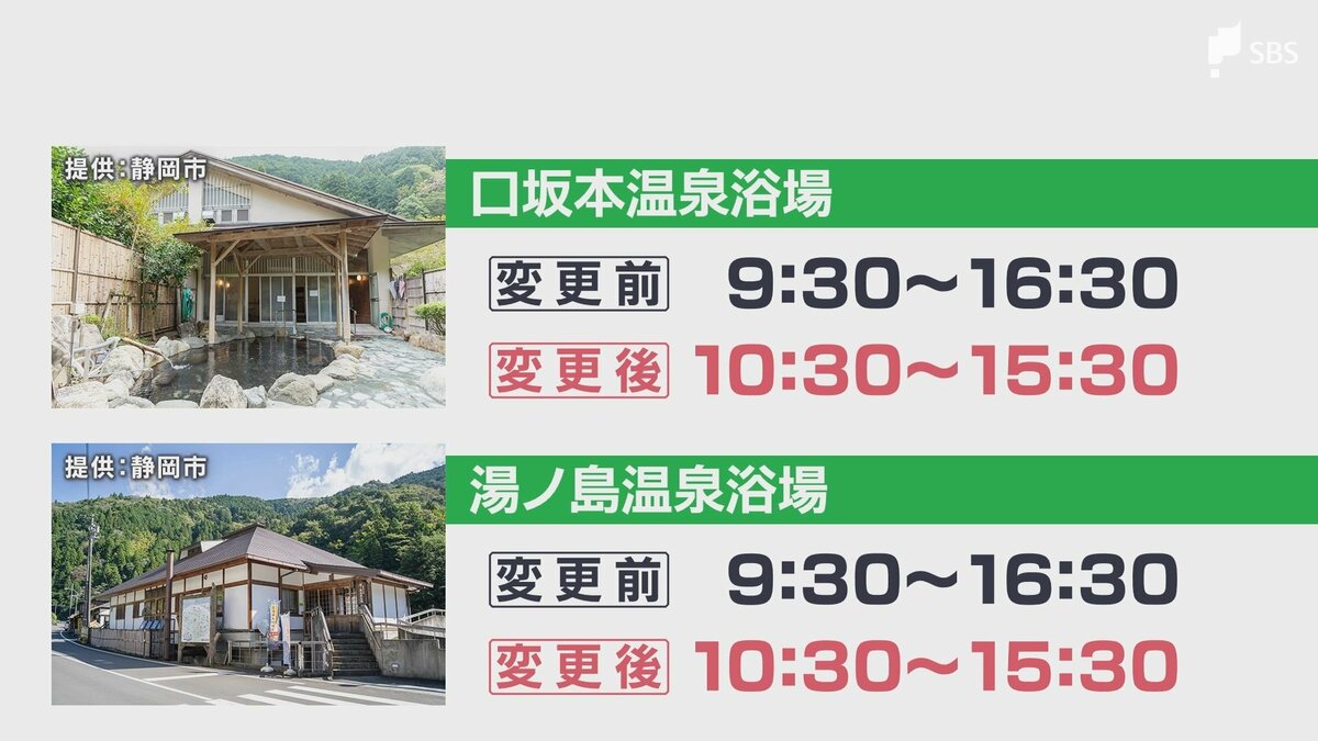 静岡市葵区の「口坂本温泉浴場」と「湯ノ島温泉浴場」は、午前10時半から午後3時半までとなり、2時間短縮。